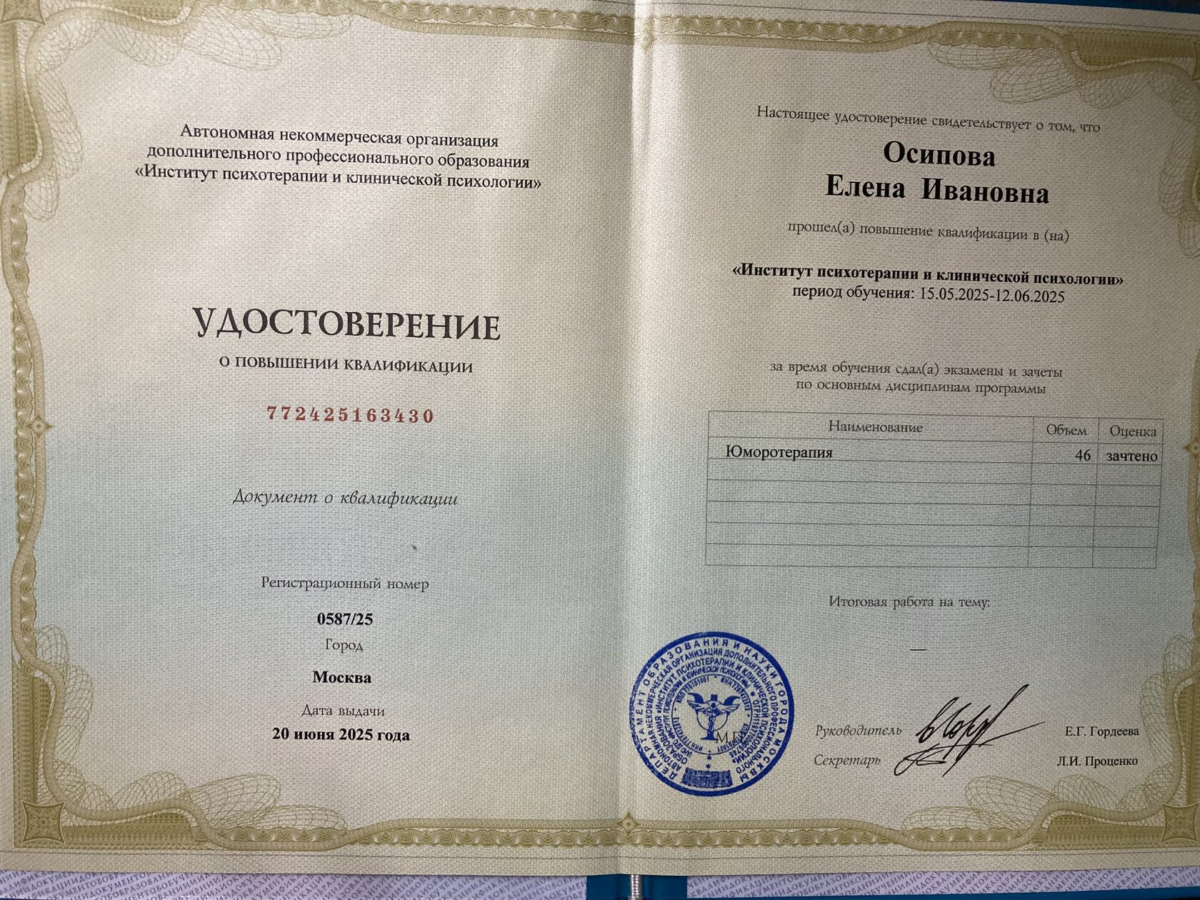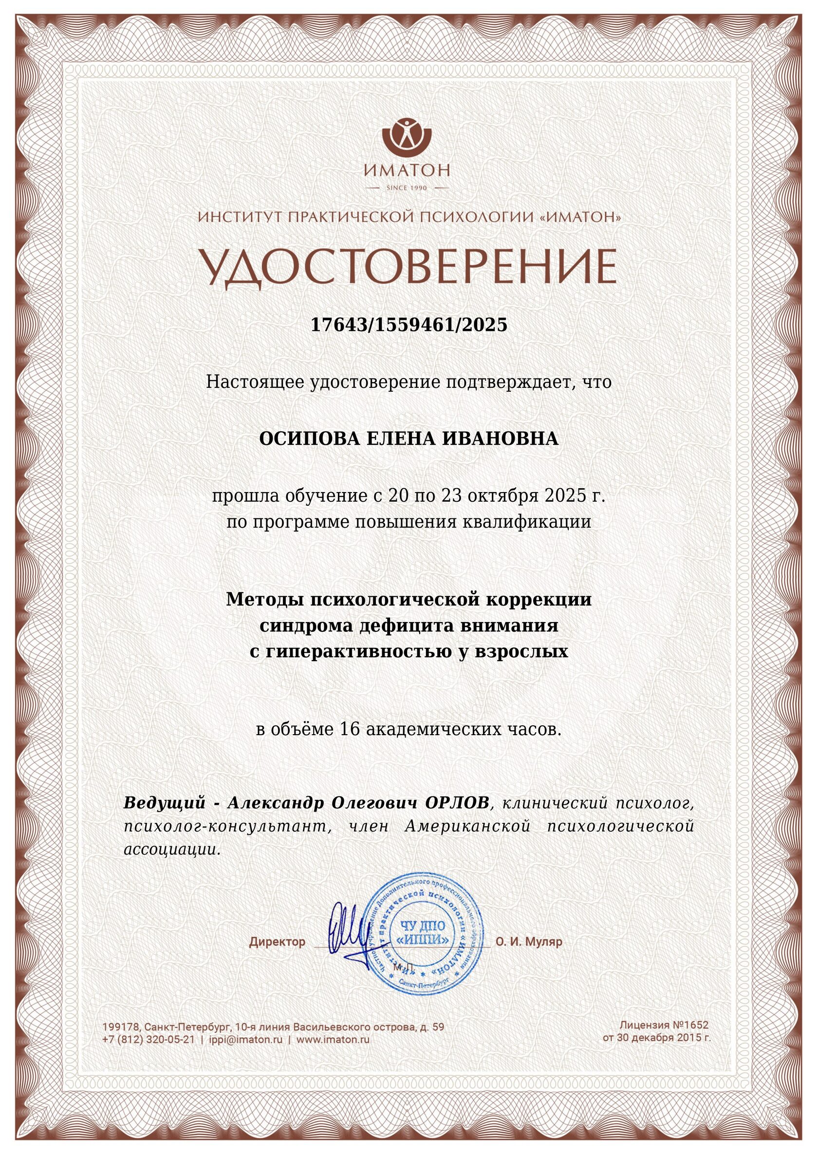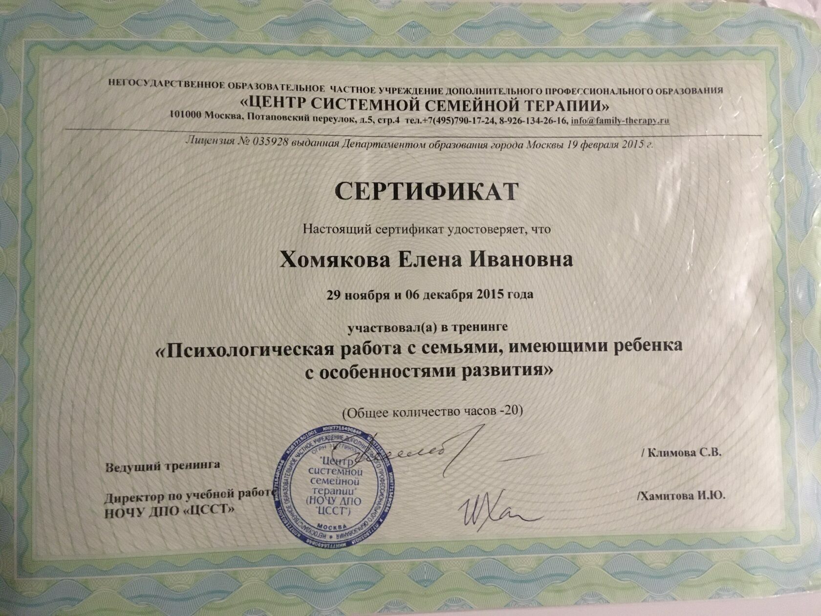 Дополнительное образование в Институте психотерапии и клинической психологии по когнитивно-поведенческой терапии (328 часов), в Центре системной семейной терапии по игровой терапии с детьми и подростками (150 часов), краткосрочной терапии, ориентированной на решение (20 часов), по работе с семьями имеющими ребёнка с особенностями развития (20 часов) и по работе с парами (18 часов). Владею методом десенсибилизации и переработки движениями глаз (ДПДГ/EMDR).