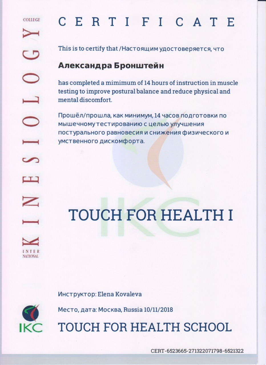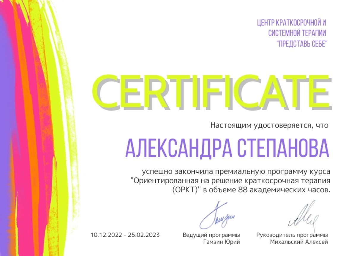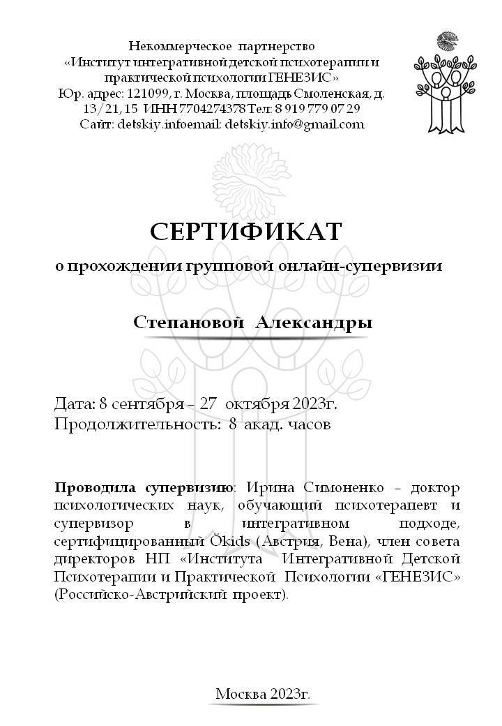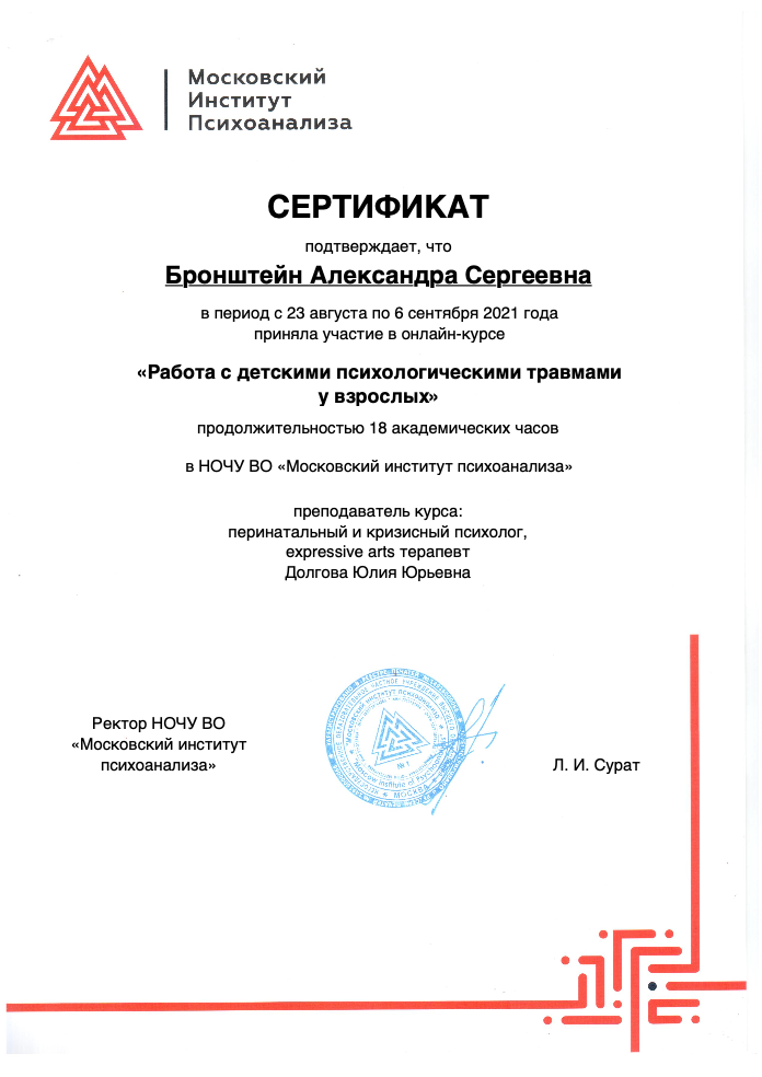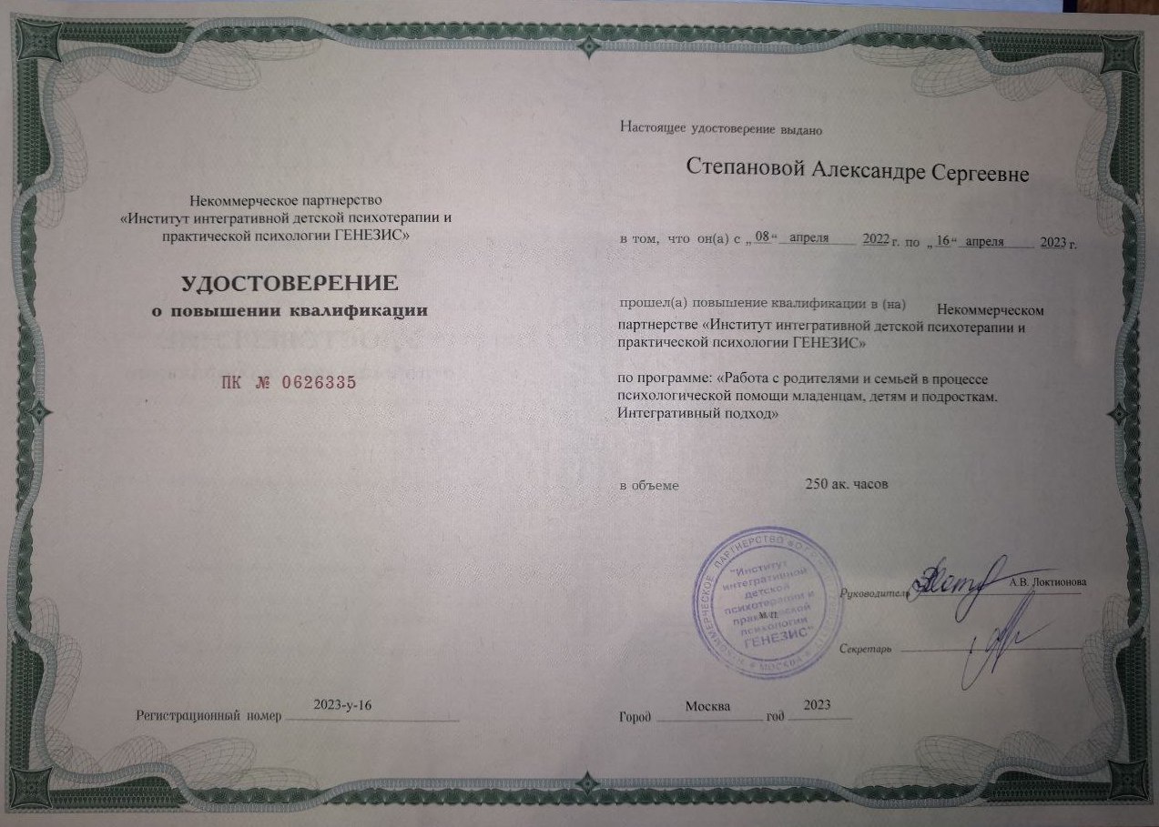 Состою в Российской Ассоциации ОРКТ (ориентированной на решение краткосрочной терапии) и в сообществе Института интегративной детской психотерапии и практической психологии «Генезис».