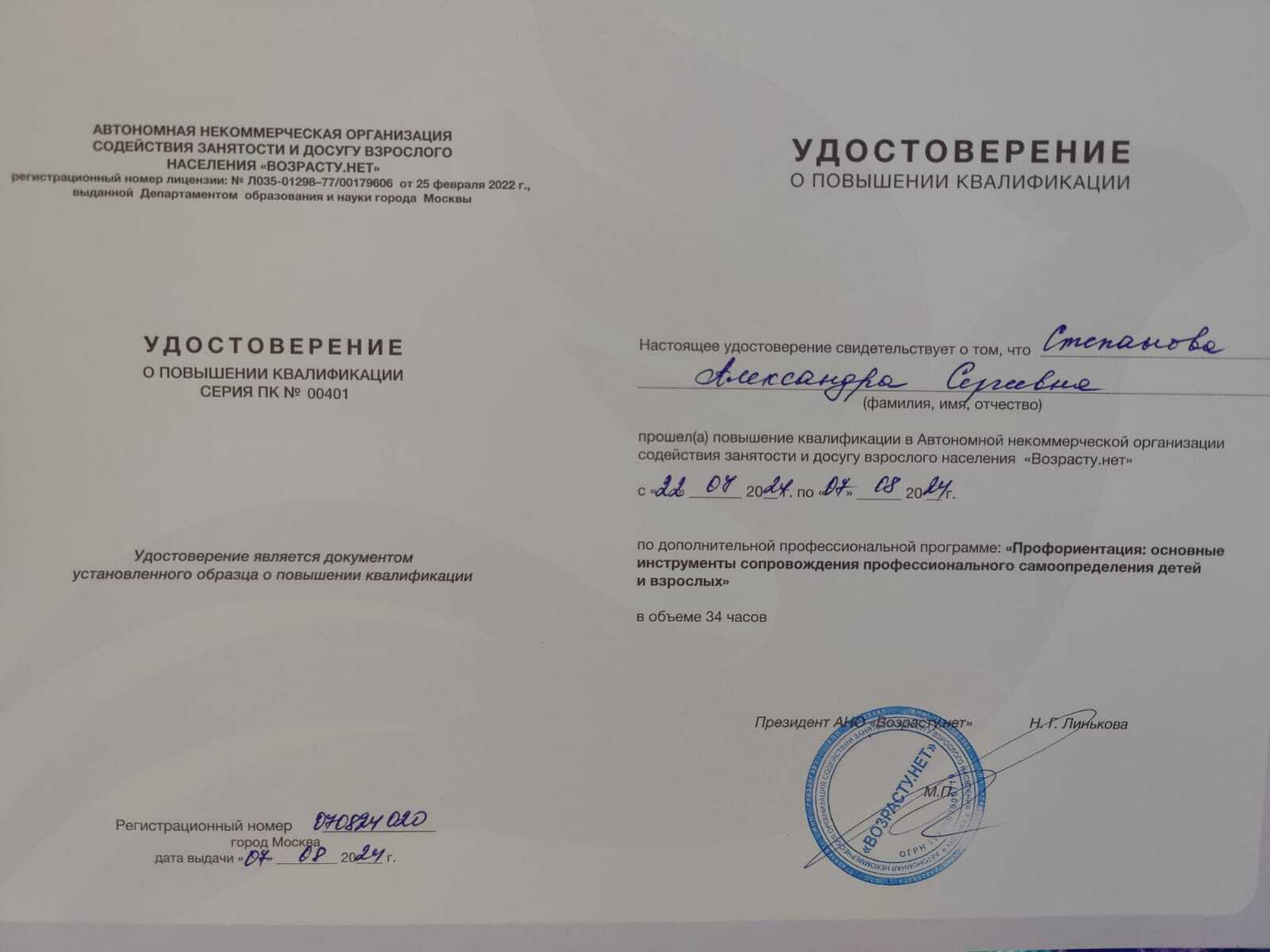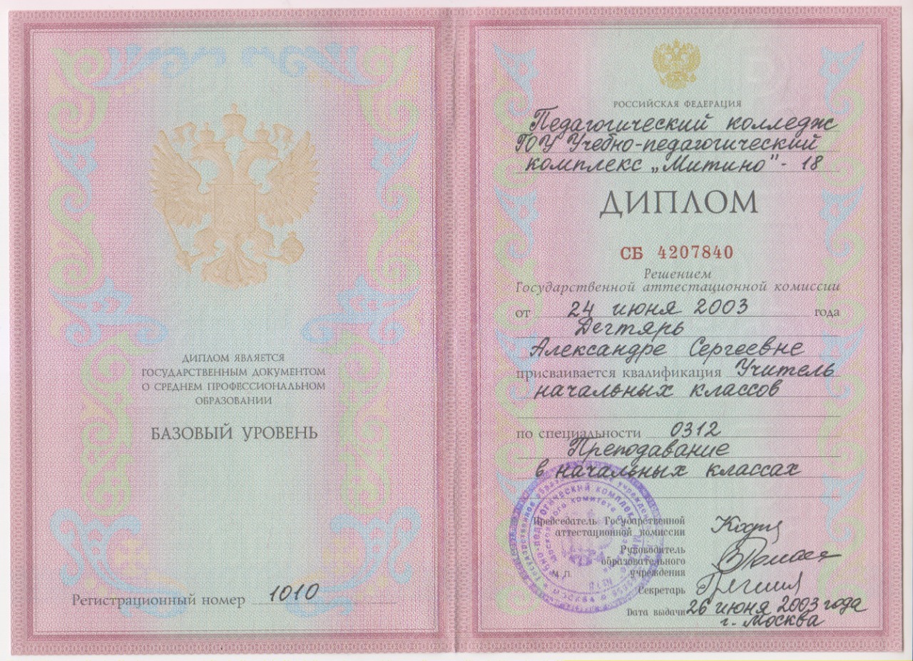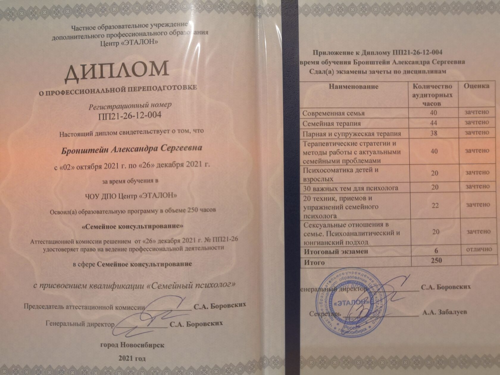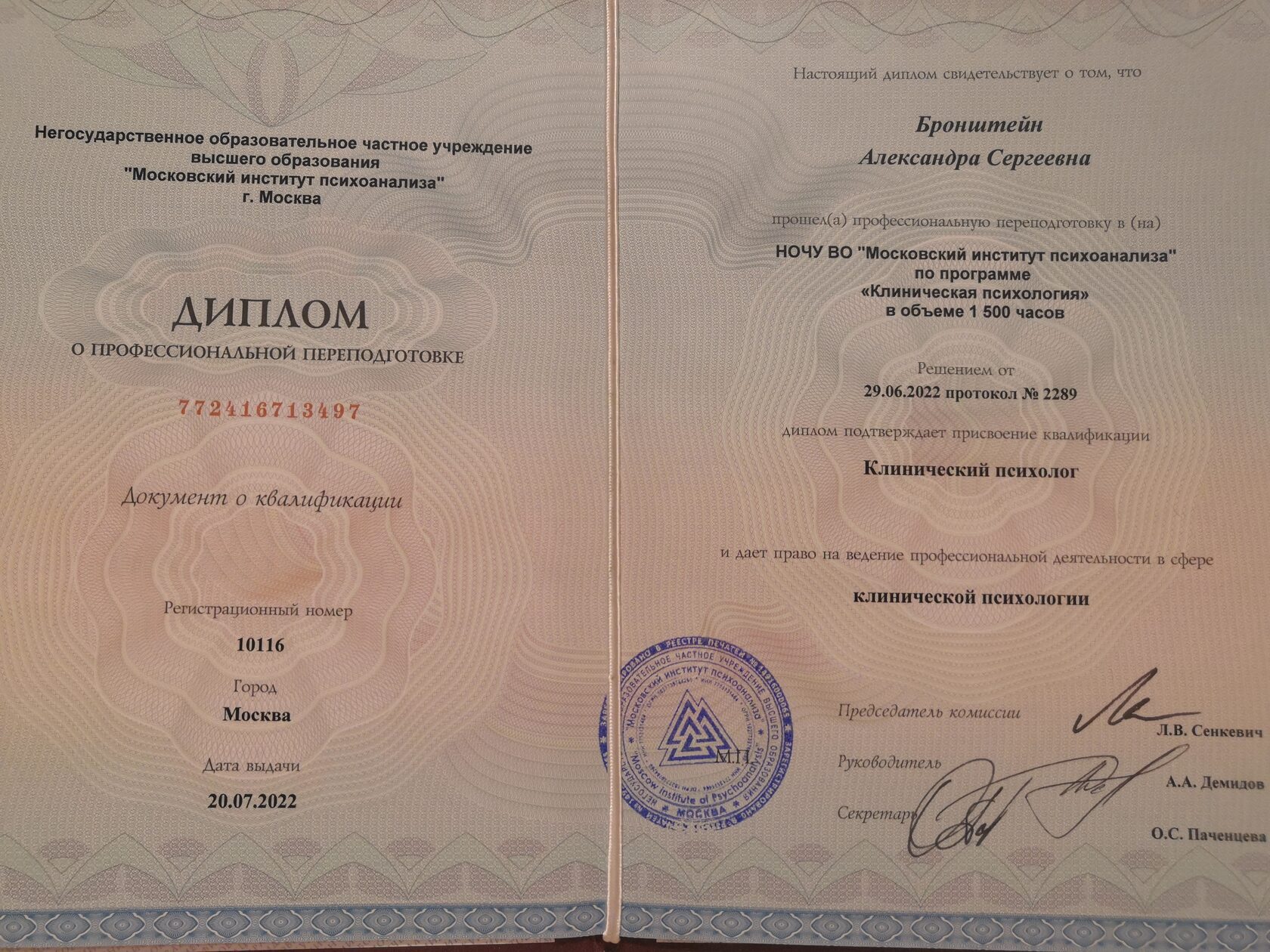 2005-2009, Московский Государственный Областной Университет (МГОУ), квалификация – психолог, преподаватель психологии. Дополнительное образование в области индивидуального и семейного консультирования (общее количество часов - 820), клинической (1500 часов) и перинатальной психологии (150 часов).