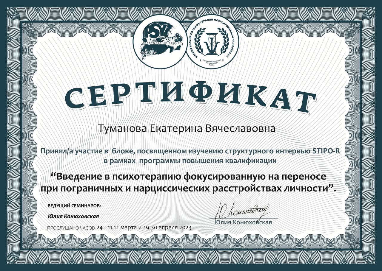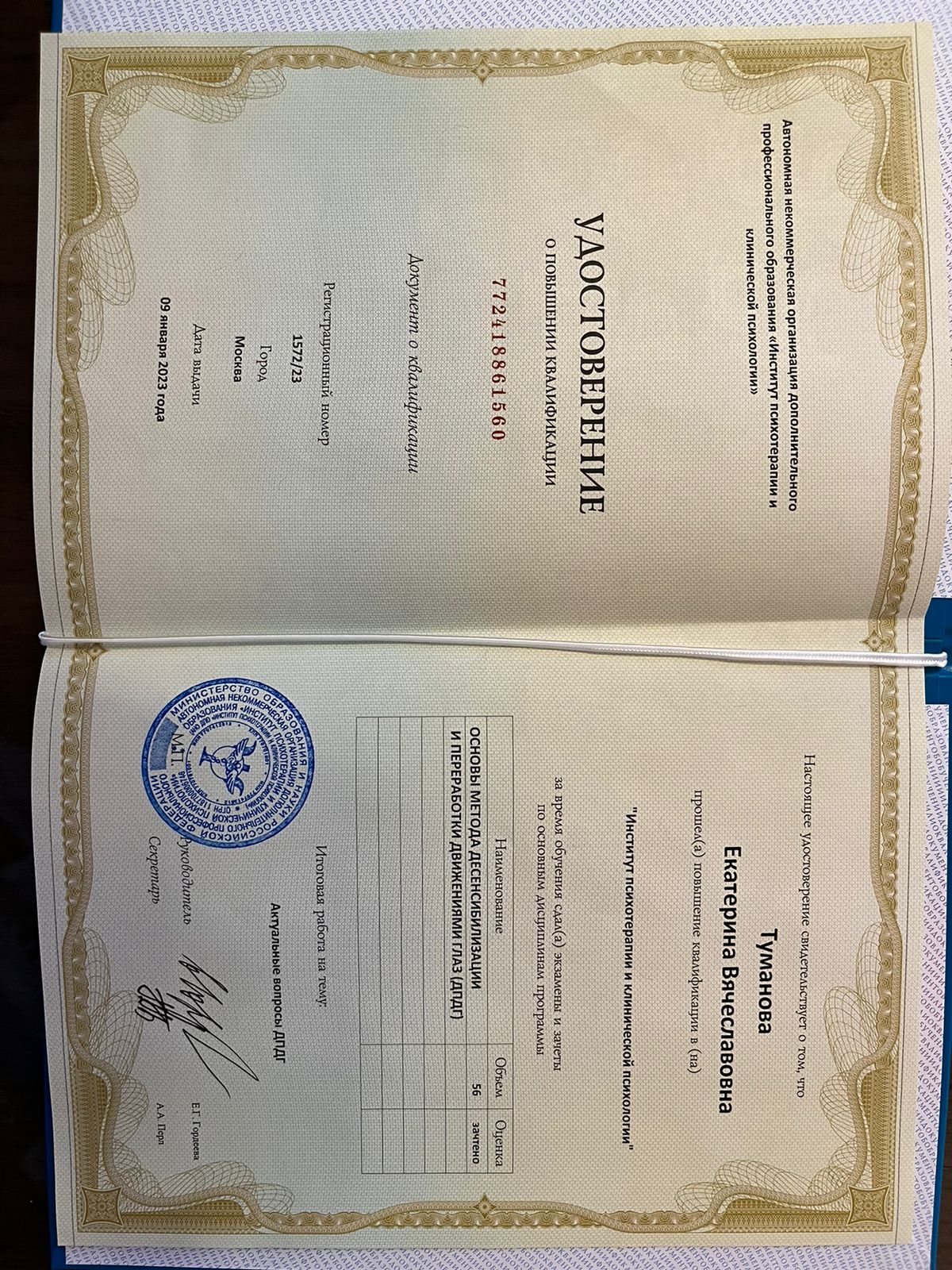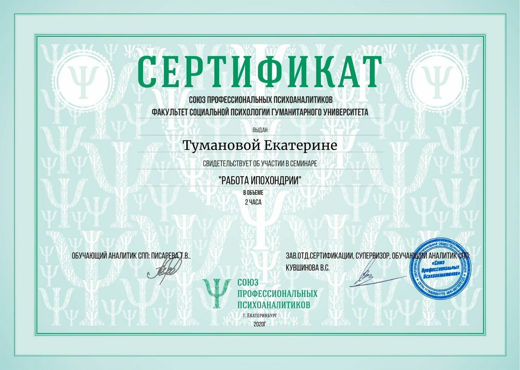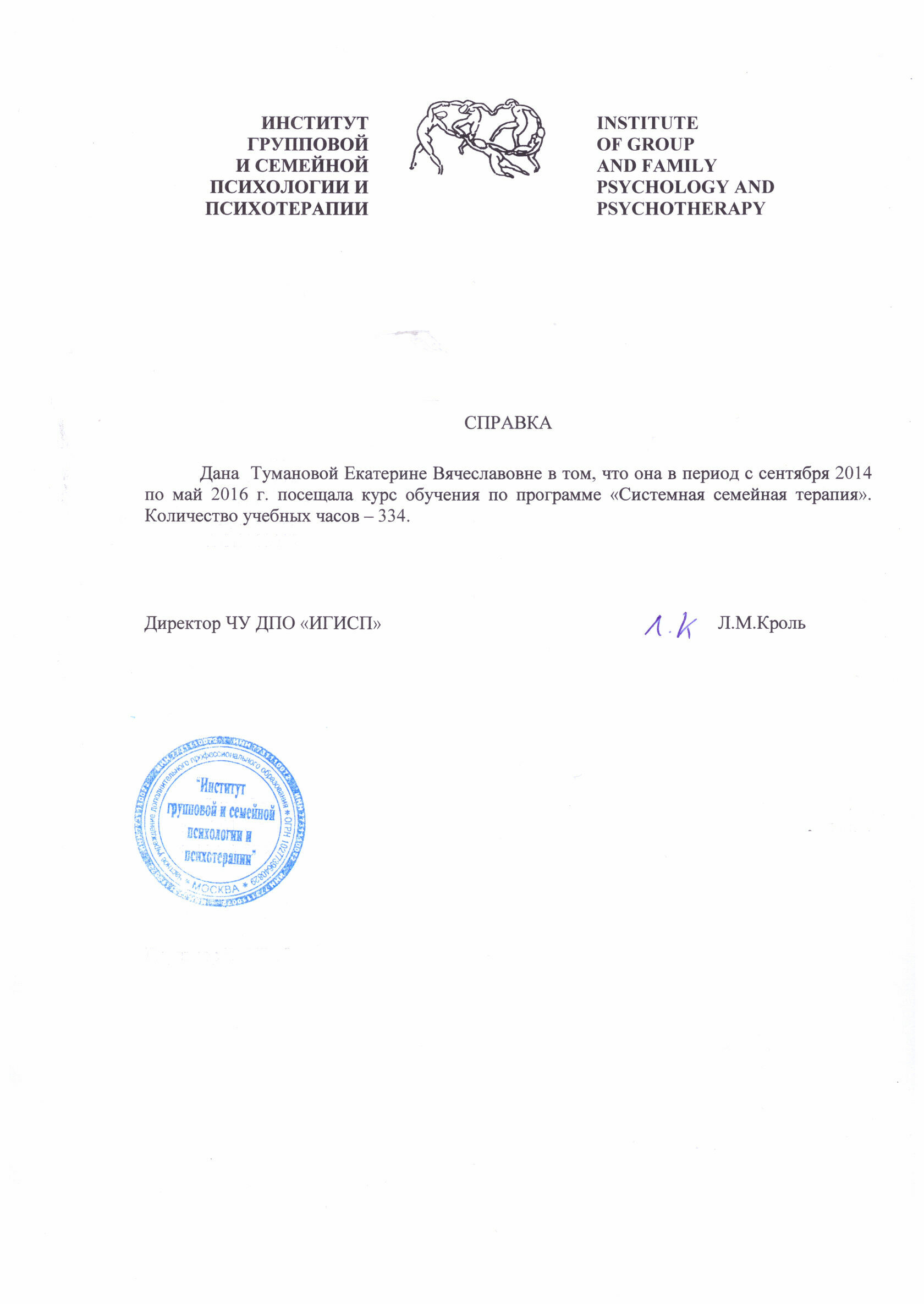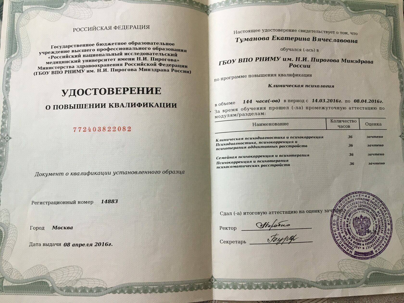 Дополнительное образование в рамках долгосрочных обучающих программ в области системной семейной психотерапии (Институт Групповой и Семейной Психотерапии), психоанализа и психосоматики (Институт Психоанализа на Чистых Прудах, Институт Психосоматики Пьера Марти, Париж).