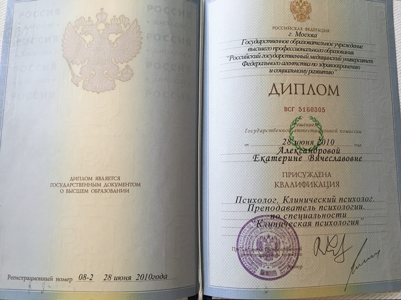 2004-2010, Российский Государственный Медицинский Университет им. Пирогова, факультет клинической психологии.